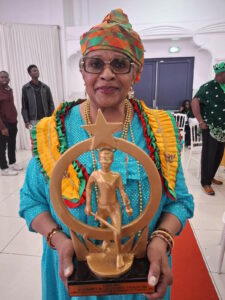 Notre artiste historique, Sylviane CEDIA, avance au rythme de sa divine Pirogue : reconnue comme AGODJIÉ, équivalent d’AMAZONE, elle a reçu avec fierté son trophée
